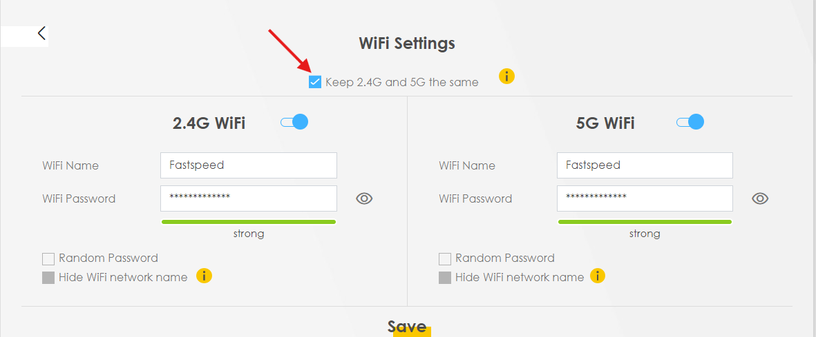 - Start med at fjerne fluebenet i boksen Keep 2.4G and 5G the same og tryk Save. (KUN HVIS DU IKKE ØNSKER AT DE 2 FREKVENSER HAR SAMME NAVN)