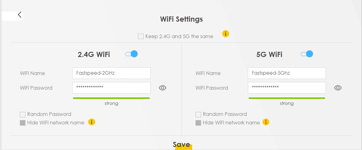 - Efter at web-interface har loadet færdig kan man nu indsætte den ønskede kode og navn på hhv. 2.4GHz og 5GHz WiFi. Afslut ved at klikke på Save.